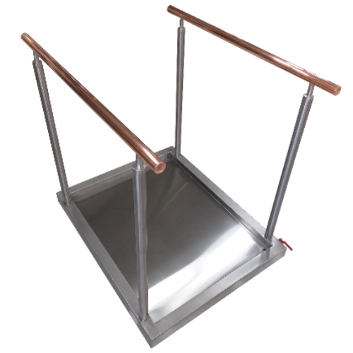 Este producto es un pediluvio sanitario en respuesta al cambio normativo que debe ocurrir en el control y desinfección de clientes y colaboradores de lugares públicos o de afluencia masiva de personas. la desinfección dual que produce este producto por considerarse limpieza de pies mediante contacto con producto químico y de manos por tratarse de pasamanos de cobre con propiedad anti-bacterial